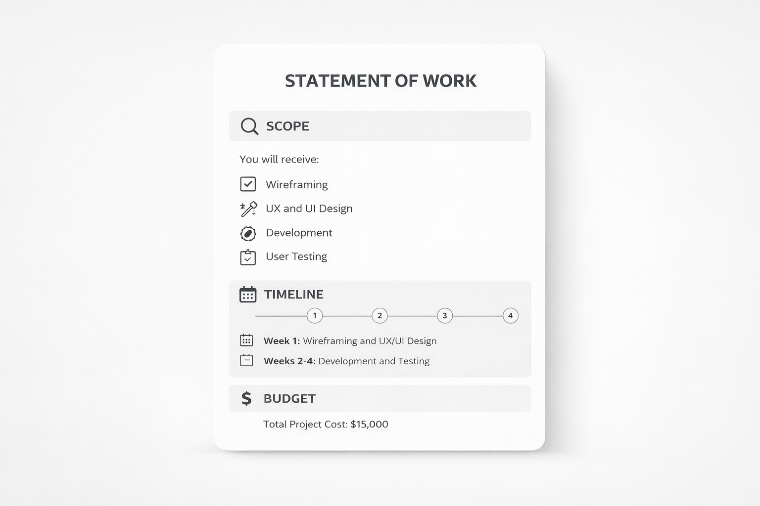 With the approved wireframes, we create a Statement of Work (SOW). The SOW outlines every screen, integration, data source, user role, and edge case that will be built. It also explains what’s excluded. This document becomes the project’s contract: no guesswork, no hidden items, no surprises. Everything that matters for delivery and cost goes into the SOW before any code is written.
