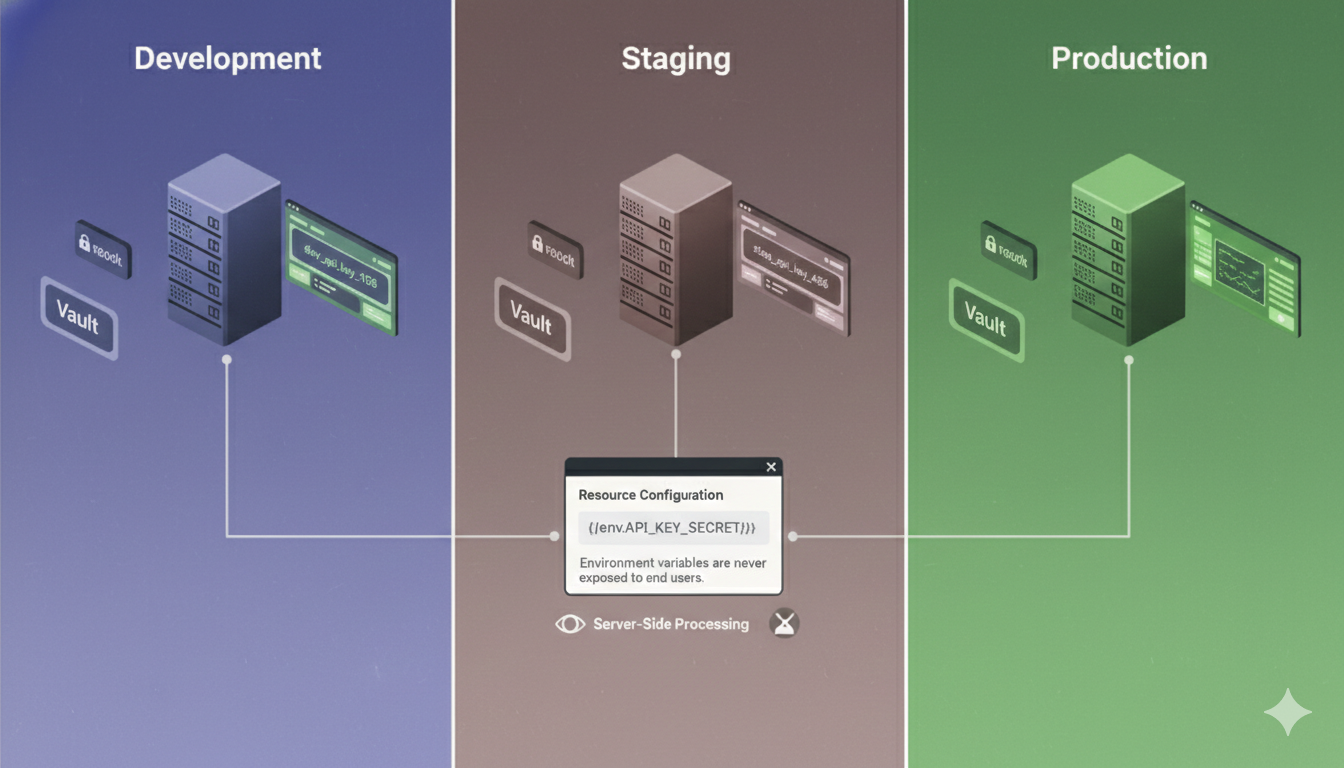 Just as important, environment variables are never exposed to end users. They are resolved server side and remain invisible to the frontend. This makes them suitable for highly sensitive secrets that require strict handling.