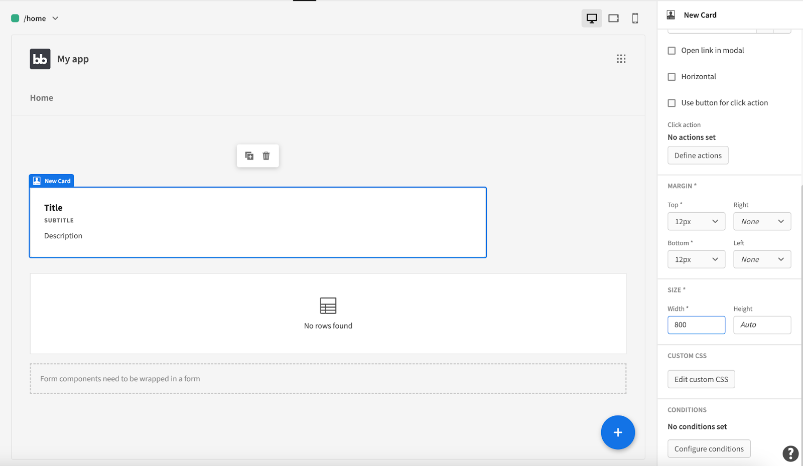 Budibase apps are organized into screens, each representing a page. Components can be dragged in, styled, and configured. However, horizontal placement is clunky — margins must be manually defined instead of true drag‑and‑drop.