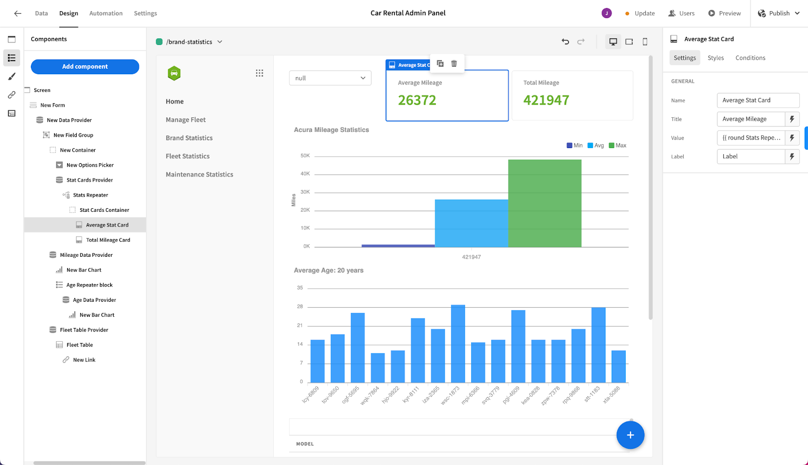 Budibase organizes development into three tabs: Data, Design, and Automate. The IDE is highly visual, with dropdowns, forms, and drag‑and‑drop components. This makes it easy for non‑technical users to build CRUD apps quickly.